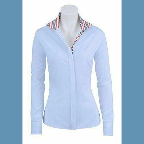 RJ Classics Ladies' Show Shirt Long sleeve, blue, luxury cotton blend show shirt that is classic but with plenty of updated detailing. This lovely shirt features blue multi stripe trim on the inside of the collar and cuffs. In addition, an angled snap collar for a modern, yet timeless look. Luxury cotton blend. Blue - size 46.