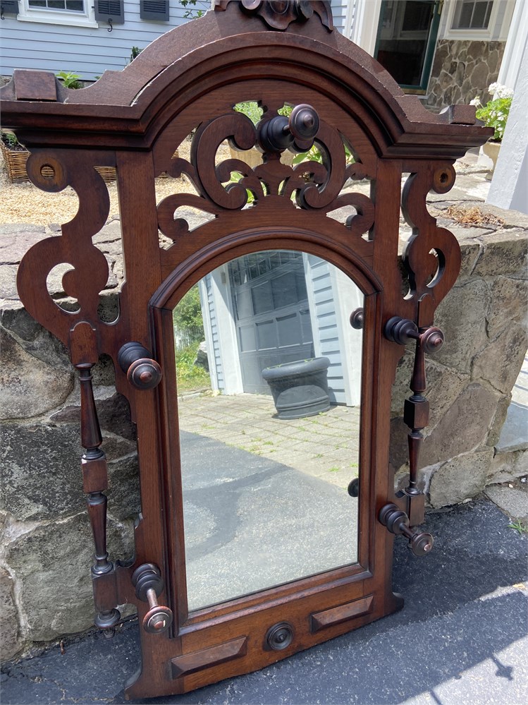 Beautiful, large mirror. Antique, appears to be hand carved but we do not have any more information on the style. Missing two hat pegs, one peg is damaged (but can still be used). Top piece and pegs detach.