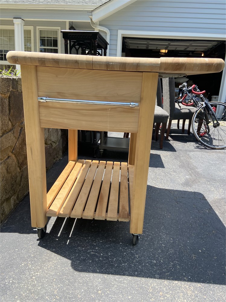 With deep drawer, shelf, and lockable wheels. One extendable leaf and towel/hanging racks.