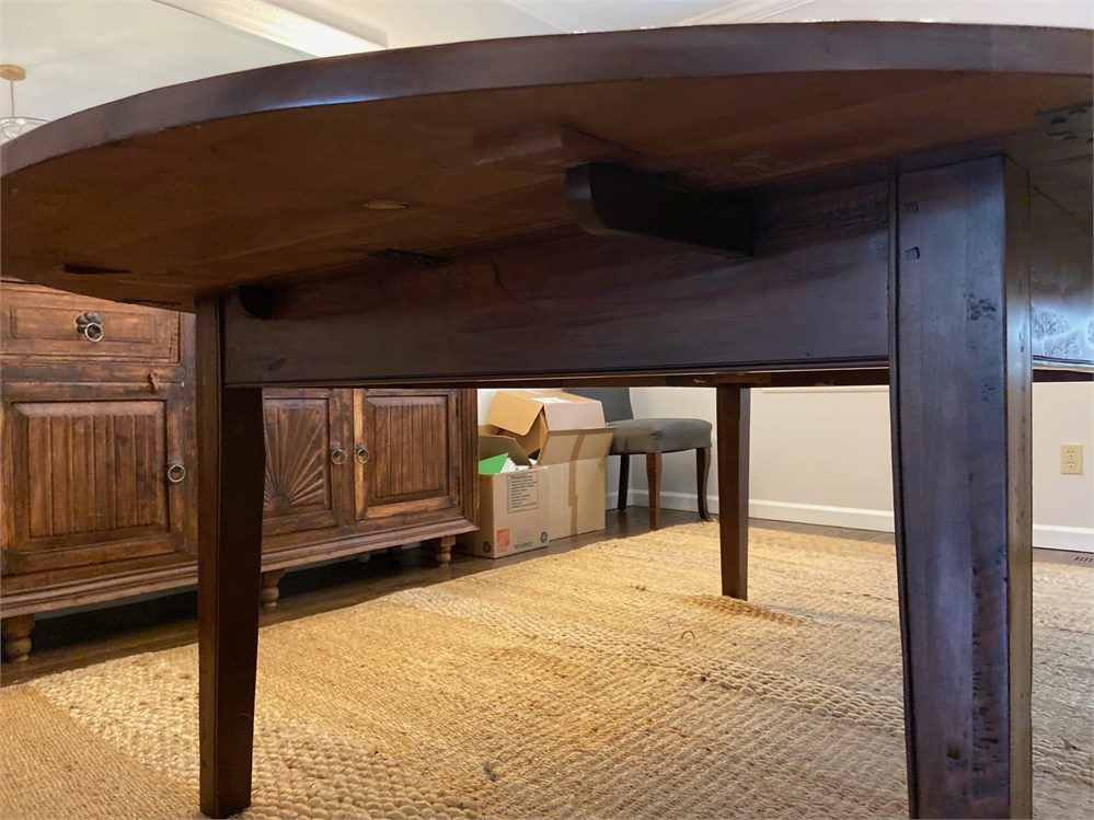 Very high quality dining table suitable for a large room. Rustic hand scraped then polished top. Slight damage to one drop-down from move, undetectable when set up, see last photo. Without leaves it is a 60" circle, adding the two leaves makes it oblong.