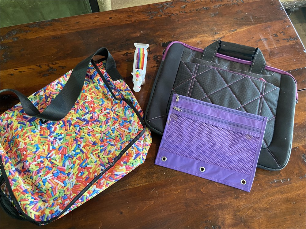 Suitcase, tote, pencil case, candy covered messenger bag