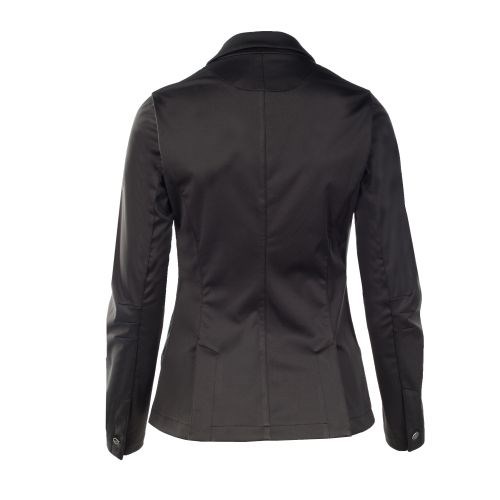 Show coats need to fit perfectly so they don't distract from your performance. This jacket is well-tailored and fitted to allow for plenty of range of motion and a sleek look. The stretchable, water repellent, high quality fabric is designed to move as you ride without binding, and the elbow area is custom-fit to bend while you move. The metallic gold-tone buttons are embossed with the signature Horze Crescendo emblem and the back has two vents. Choose the color combination with piping and the front pockets, lapel, collar and back slits are lined with attractive silver piping. The emblem on the left shoulder is the finishing touch on this practical show jacket.