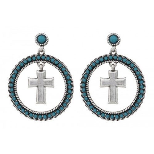 NEW Rock 47 by Wrangler Earrings Rock 47 by Wrangler licensed fashion earrings in the Rocks and Roll design collection. This set of silver-tone dangle earrings on hypoallergenic stainless steel posts features a circle halo of turquoise colored stones dangling a silver tone cross charm in the middle.Retails $29.99