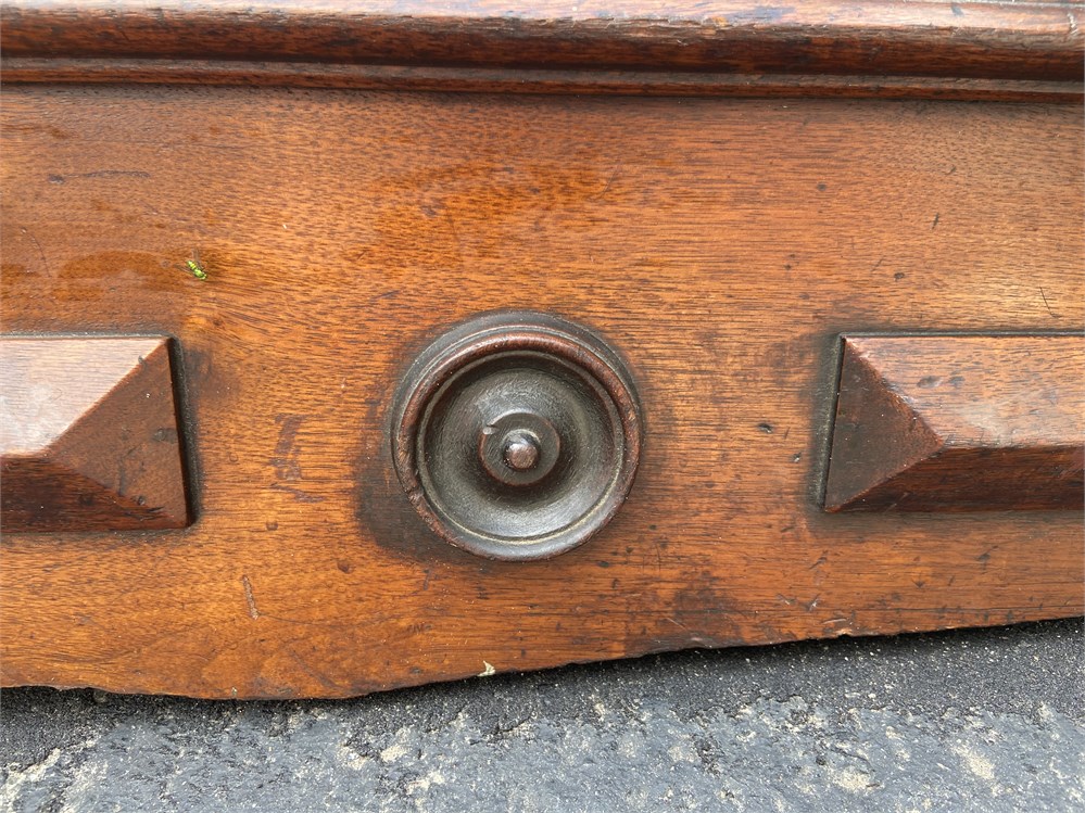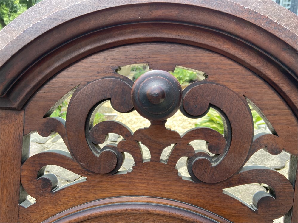 Beautiful, large mirror. Antique, appears to be hand carved but we do not have any more information on the style. Missing two hat pegs, one peg is damaged (but can still be used). Top piece and pegs detach.
