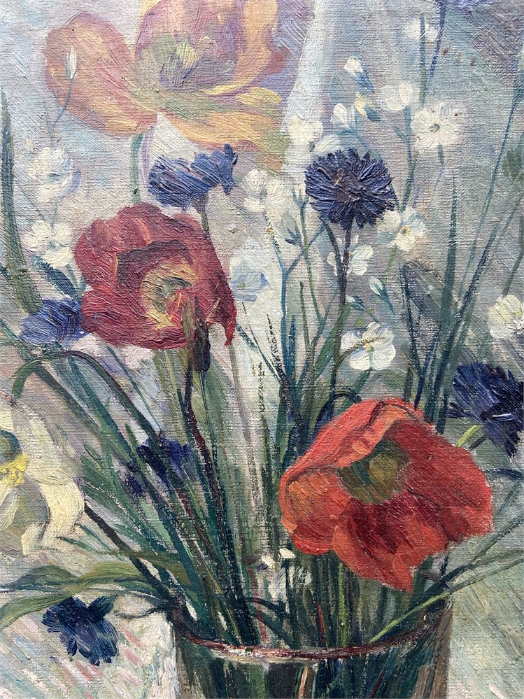 Lovely antique still life including poppies in a vase, gorgeous colors. Purchased in England.
