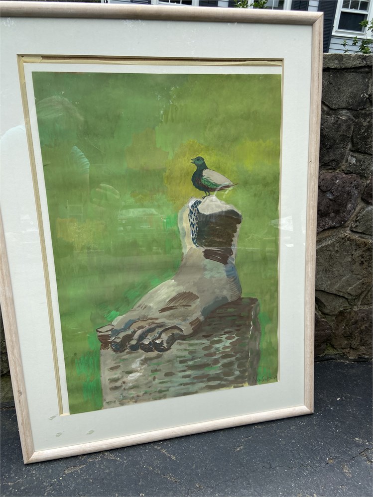 Oil on paper painting of a bird sitting on a statue remnant, in vibrant colors View Watchlist >