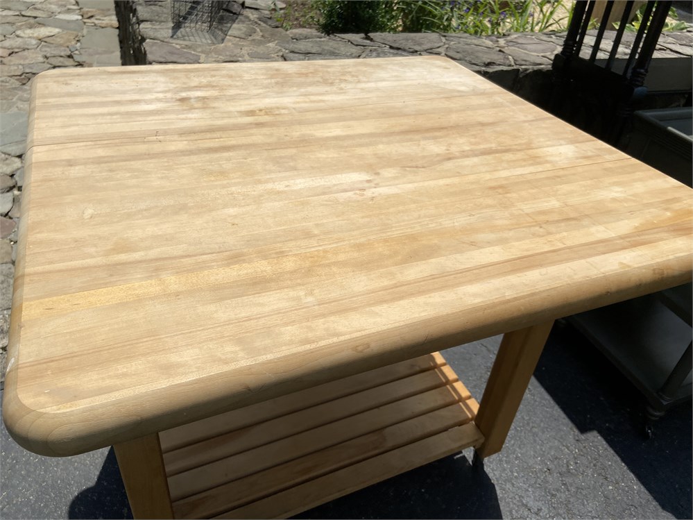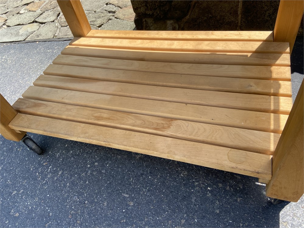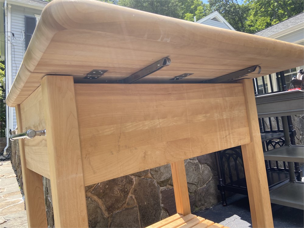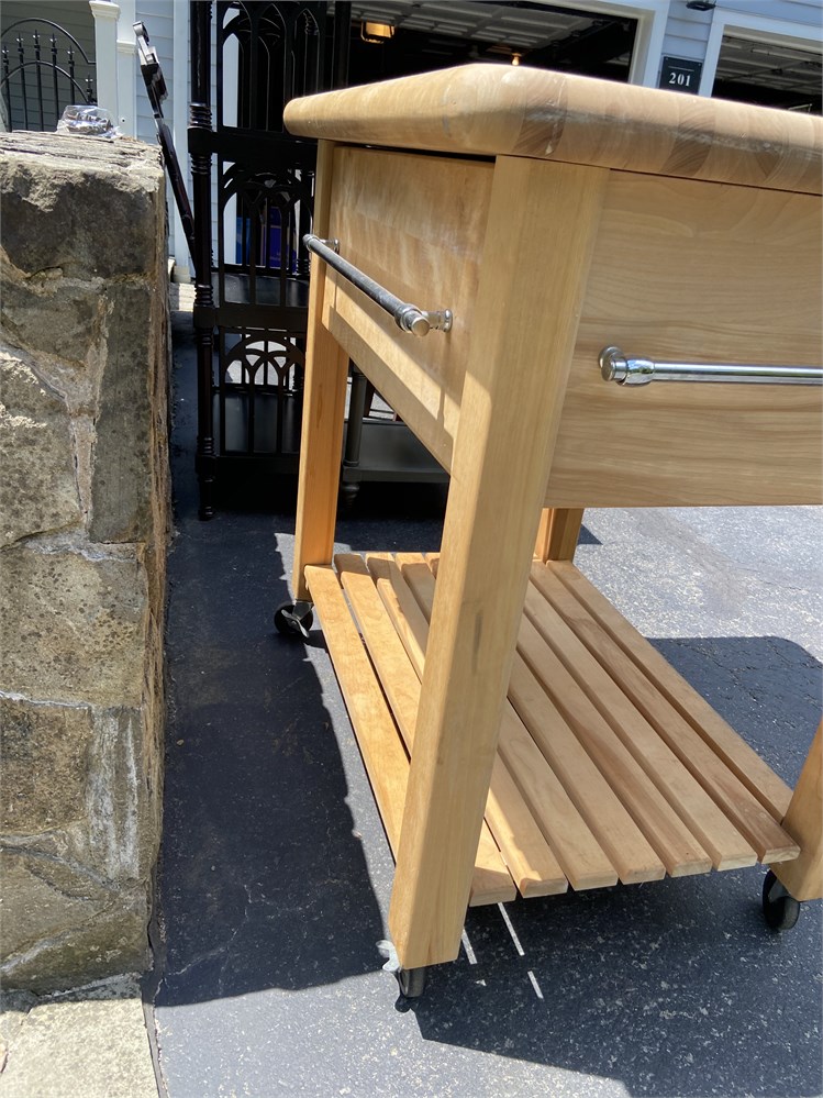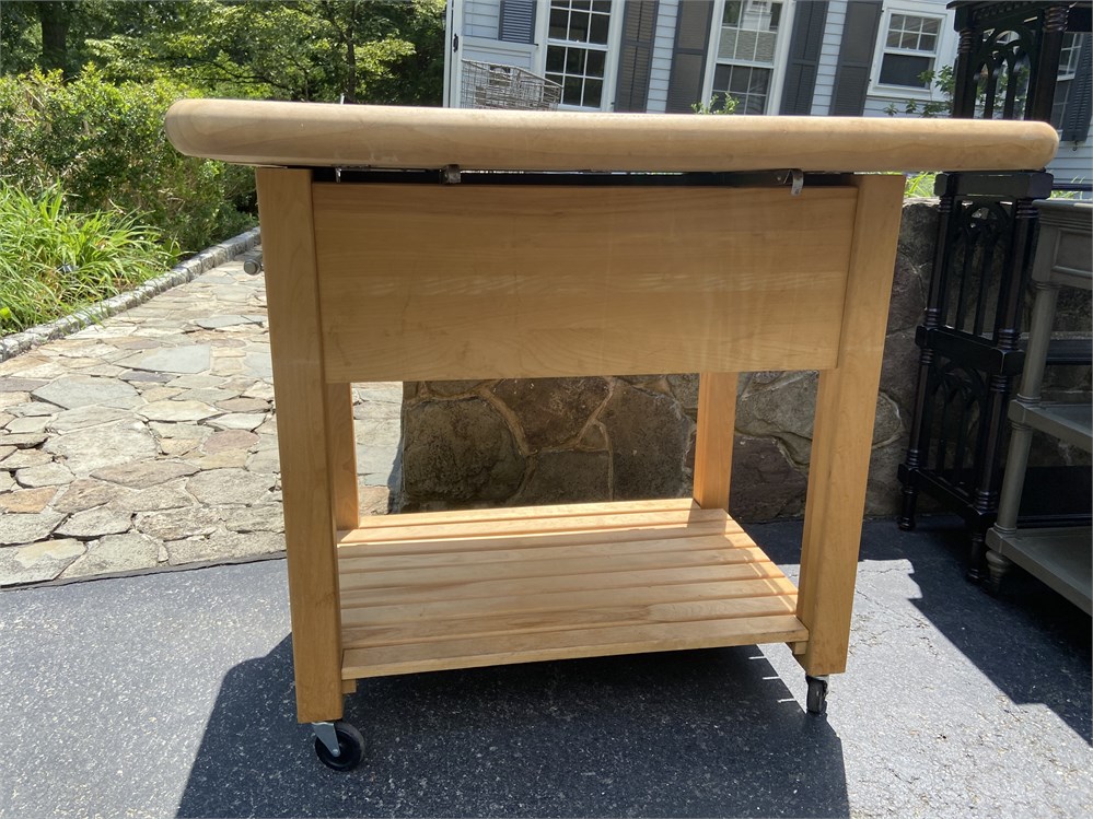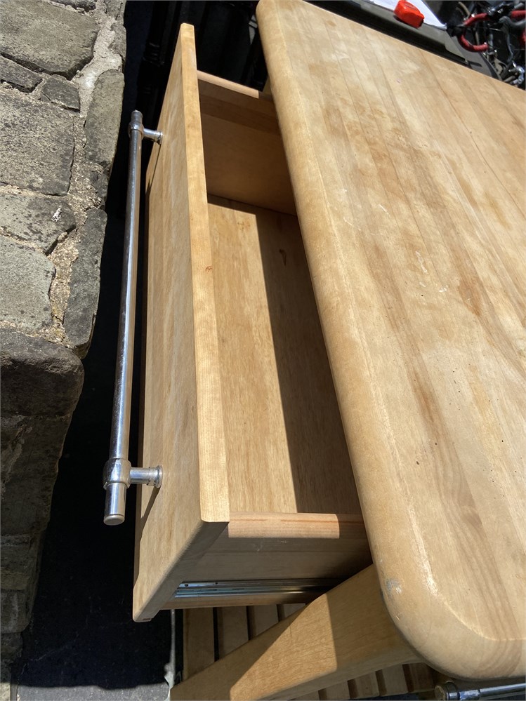 With deep drawer, shelf, and lockable wheels. One extendable leaf and towel/hanging racks.