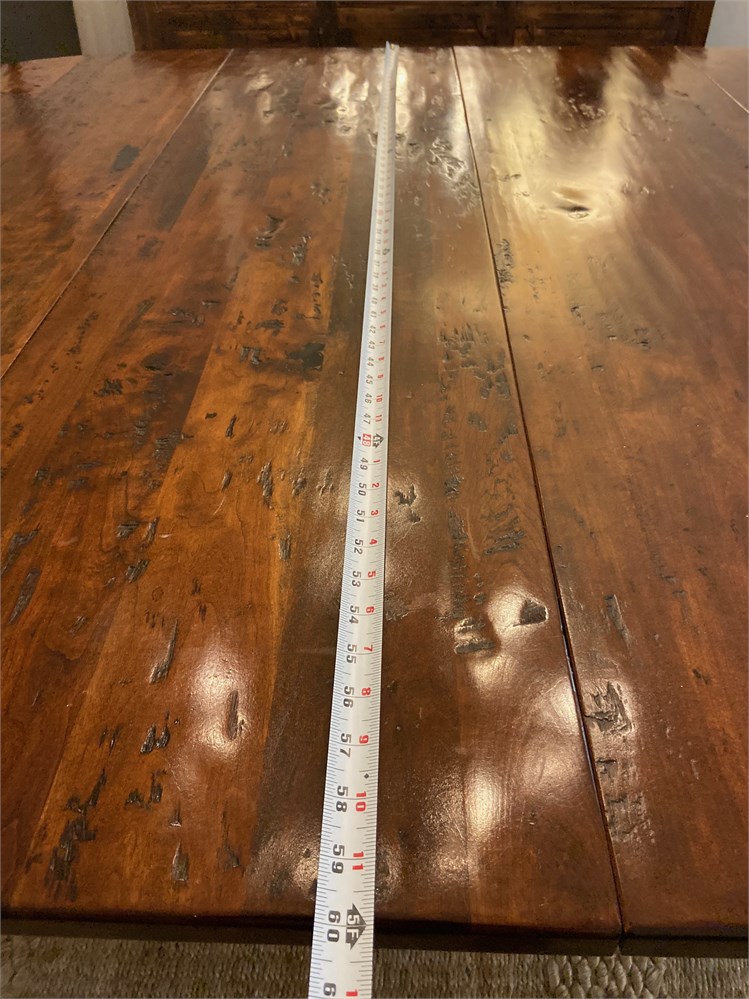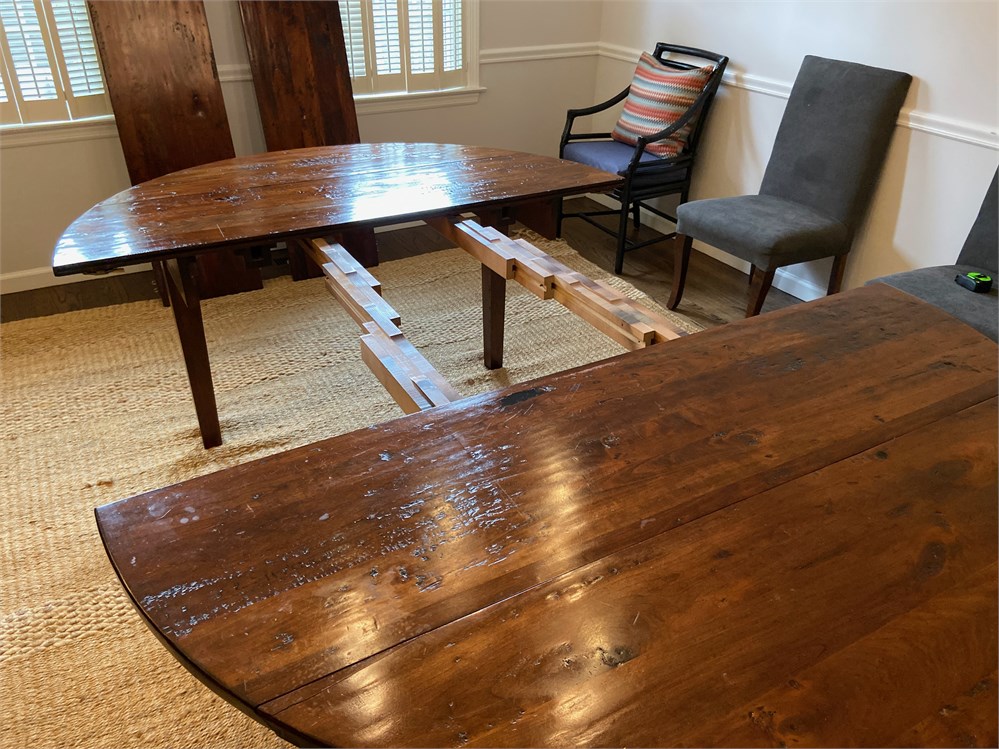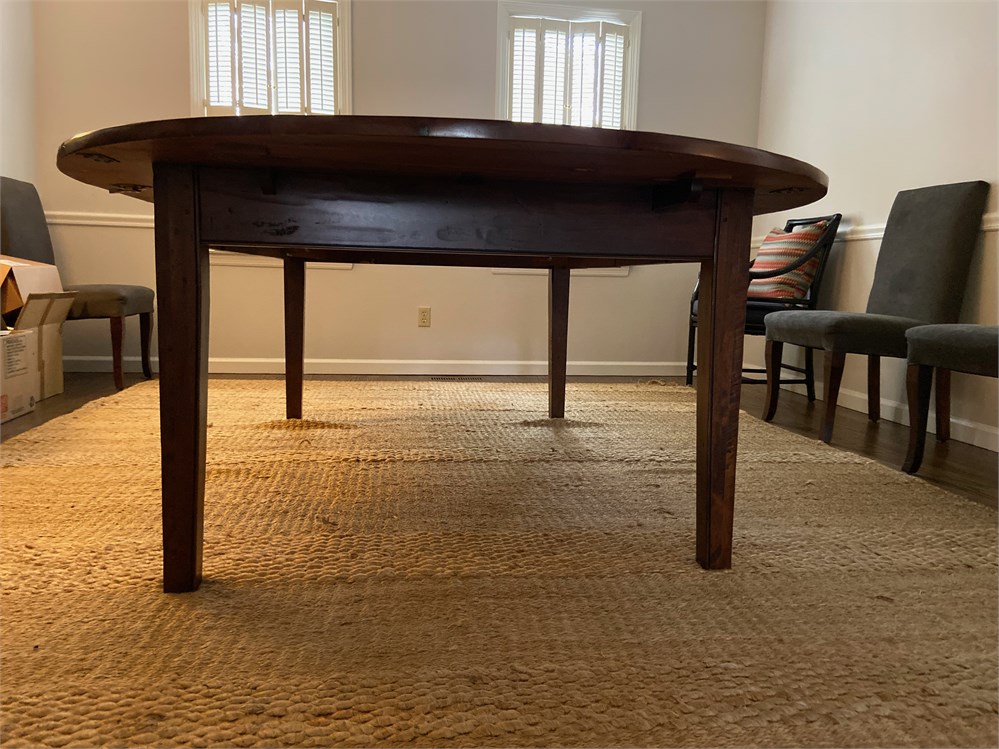 Very high quality dining table suitable for a large room. Rustic hand scraped then polished top. Slight damage to one drop-down from move, undetectable when set up, see last photo. Without leaves it is a 60" circle, adding the two leaves makes it oblong.