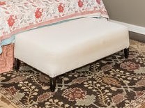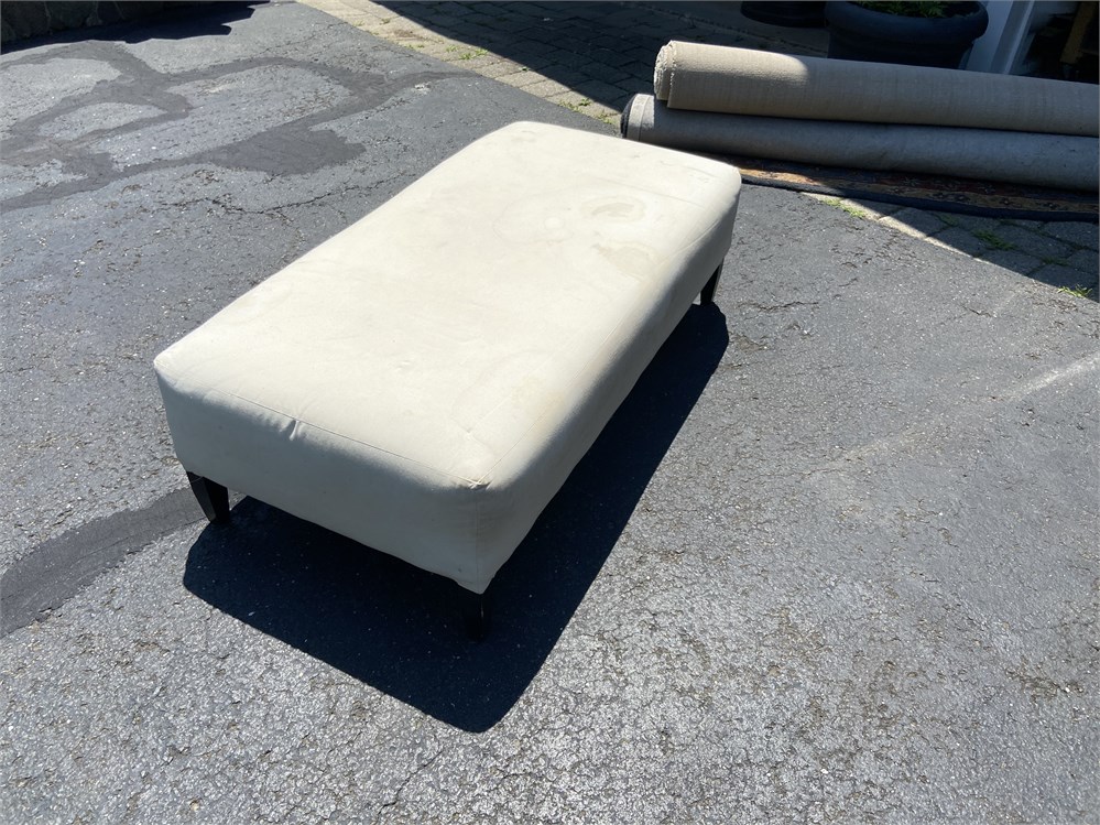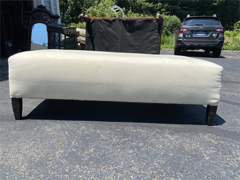 Heavy, well made oversized upholstered bench to be used with a slipcover. Dark wood legs.