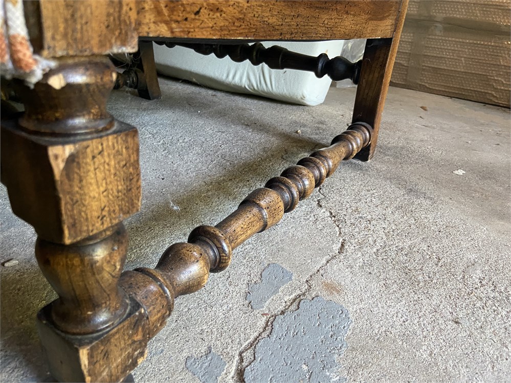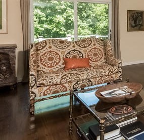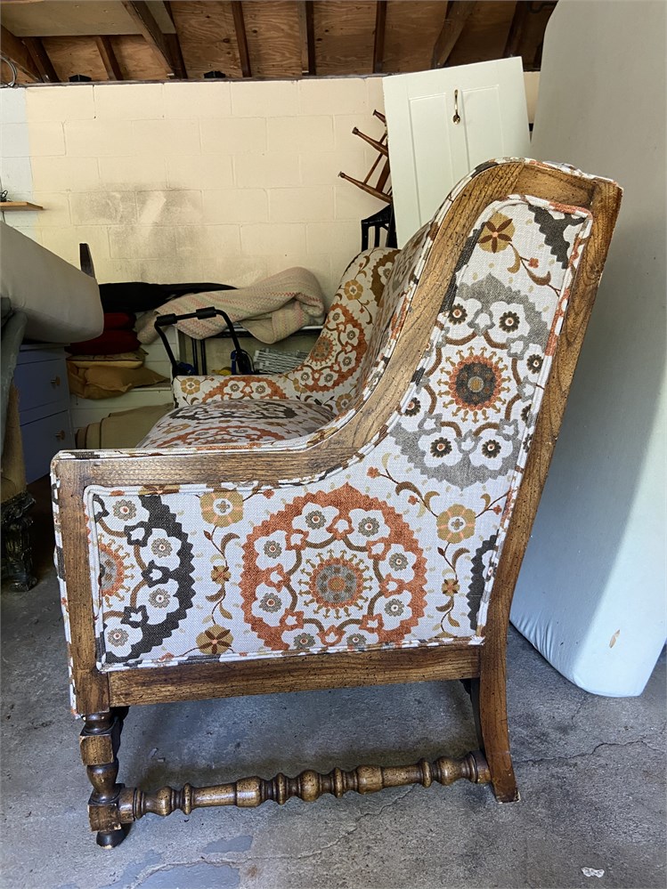 Upholstered with Ballard Designs heavy linen suzani fabric. Turned wood legs