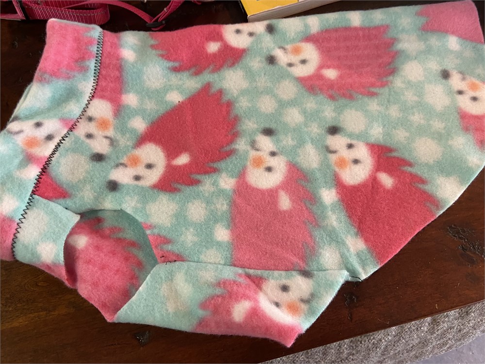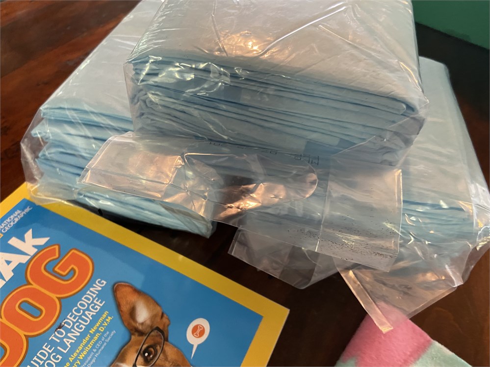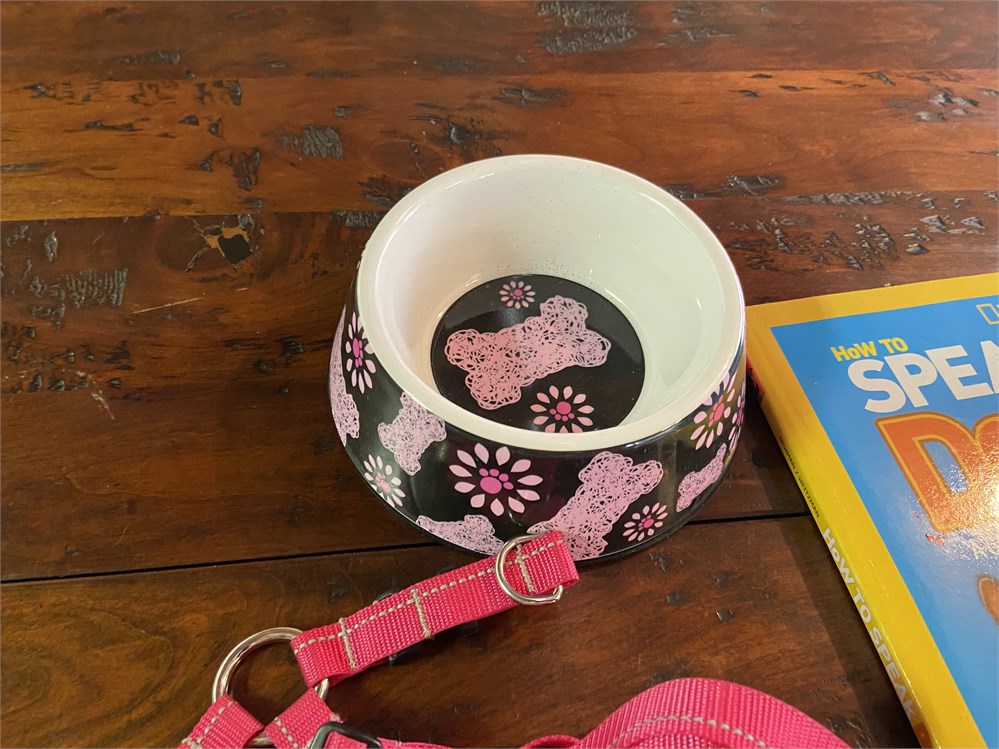 Training book, food bowl, fleece sweater, unopened pee pee pads, xs harness and small bed.