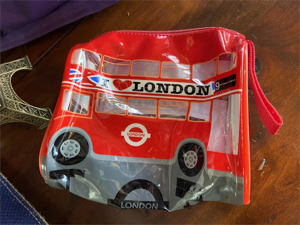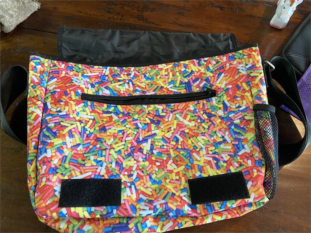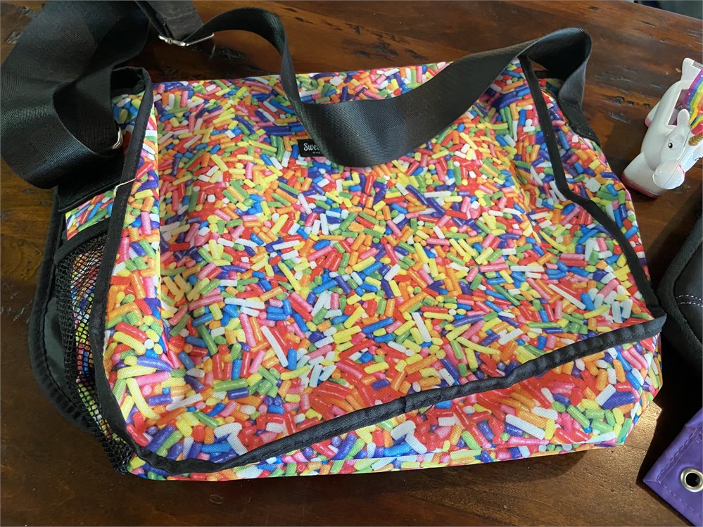 Suitcase, tote, pencil case, candy covered messenger bag