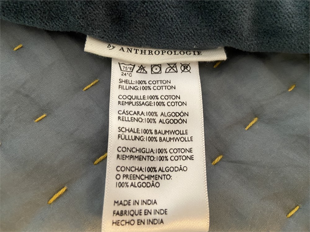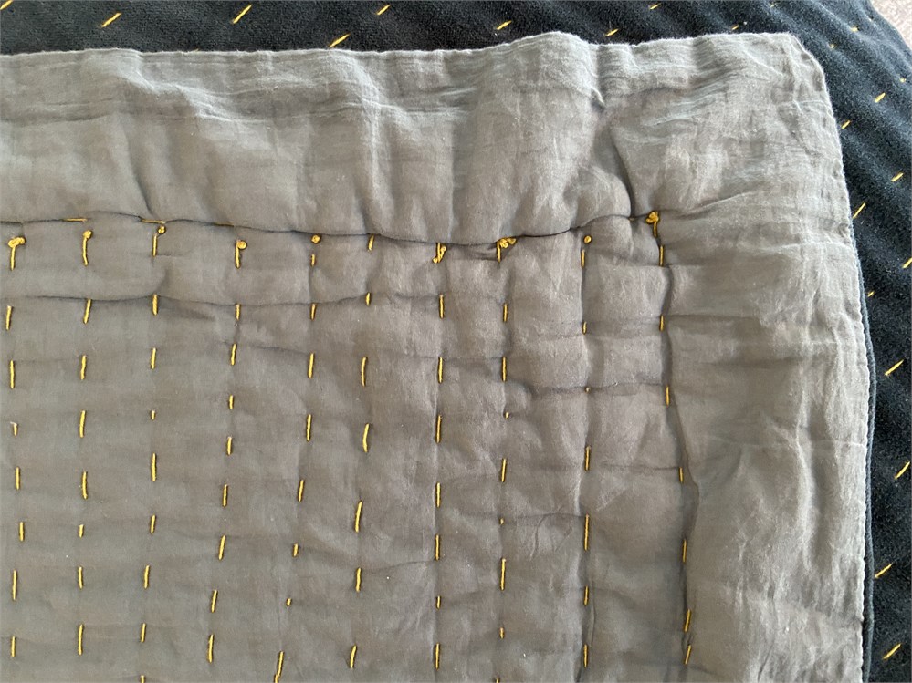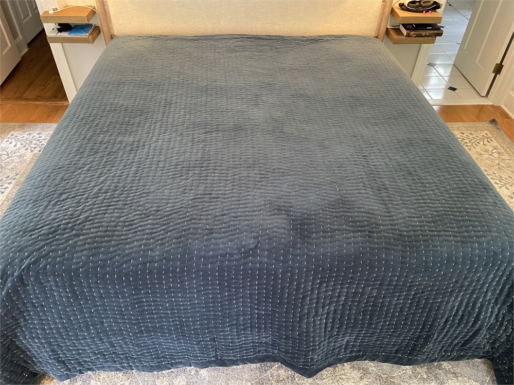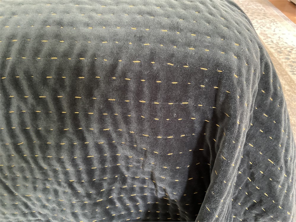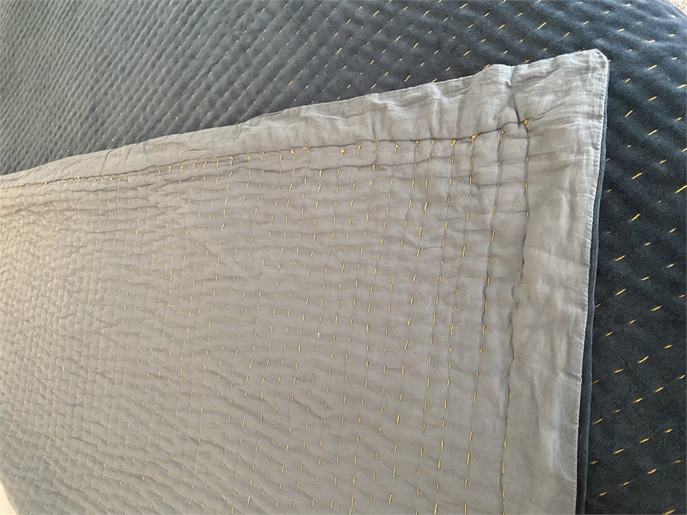 104" x 96", 100% cotton velvet in deep teal with gold Kantha stitch detail. First photo is from Anthropologie web site and shows the color more accurately.