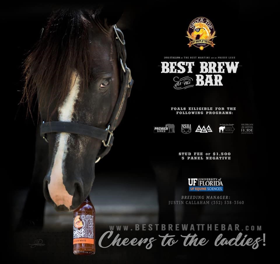 "Shock Top" is a 2015 Stallion by The Best Martini and out of Prissy Leggs. He is a multiple Congress and NSBA World Champion as well as Futurity Champion at some of the top futurities around the country! Standing the 2021 season at UF-Gainesville.