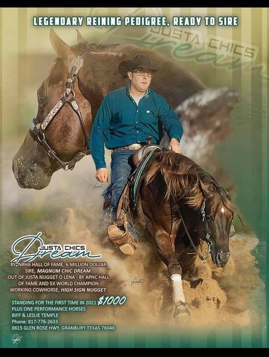 Sire by NHRA Hall of Fame and $6,000,000.00 winner, Magnum Chic Dream, out of ApHC Justa Nugget O Lena by ApHC Hall of Fame and 5X World Champion Working Cow Horse, High Sign Nugget.