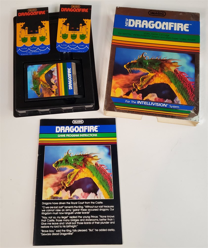 In Dragonfire, players guide a valiant prince who must retake his castle, and the priceless treasures within, from the vicious dragon who has taken over. In the first screen, the prince must make a mad dash from the right side of the screen to the castle on the left, ducking and jumping over an onslaught of fireballs. In the second screen, the prince must evade more fireballs hurled by the enormous dragon roaming the screen, gathering treasures from around the room and escaping with his life. In either stage, coming into contact with the fireball or the dragon itself is lethal. Clearing the treasure screen takes the player back to the first stage, each time more difficult than the last. Dragonfire is a good example of a game ideally suited to the Intellivision's controller, especially in the free-roaming frenzy that is the second stage. The graphics are a major improvement over the Atari VCS version of Dragonfire, and later levels heat up with faster fireballs until the prince eventually winds up deep-fried. But until the prince is literally toast, Dragonfire will get players' trigger fingers fired up.