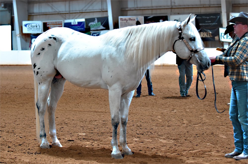 2017 White with Spots Over Hips Stallion By: Chocolatey Out Of: Cleopatra Moon Spots (granddaughter of Alias King) full pedigree can be seen at: https://www.allbreedpedigree.com/chipdnwhitechocolate Carrying the strong athletic performance genes of the great Chocolatey and a granddaughter of great Appaloosa sire Alias King, this handsome young stallion has only been bred to a couple of mares to-date and his oldest foal is coming 2. Those foals have been striking to look at but equally as important is their people pleasing personality and quickness to learn. His first filly is being trained and shown completely by a non-pro and is a point earner in her first regional show out this year. I have not seen many stallions (or horses in general) with so much athletism and overall balance. With a foretop that reaches his nostrils, mane that flows over his shoulder and a tail that drags the ground, everyone stops to look at him. He’s been shown some locally in hand and ranch in addition to some trail riding. He is one of a VERY few 6-panel negative stallions by Chocolatey. If you are looking for that pretty athlete, this is your chance to get in on the ground floor with a young stallion that is certain to make his mark.