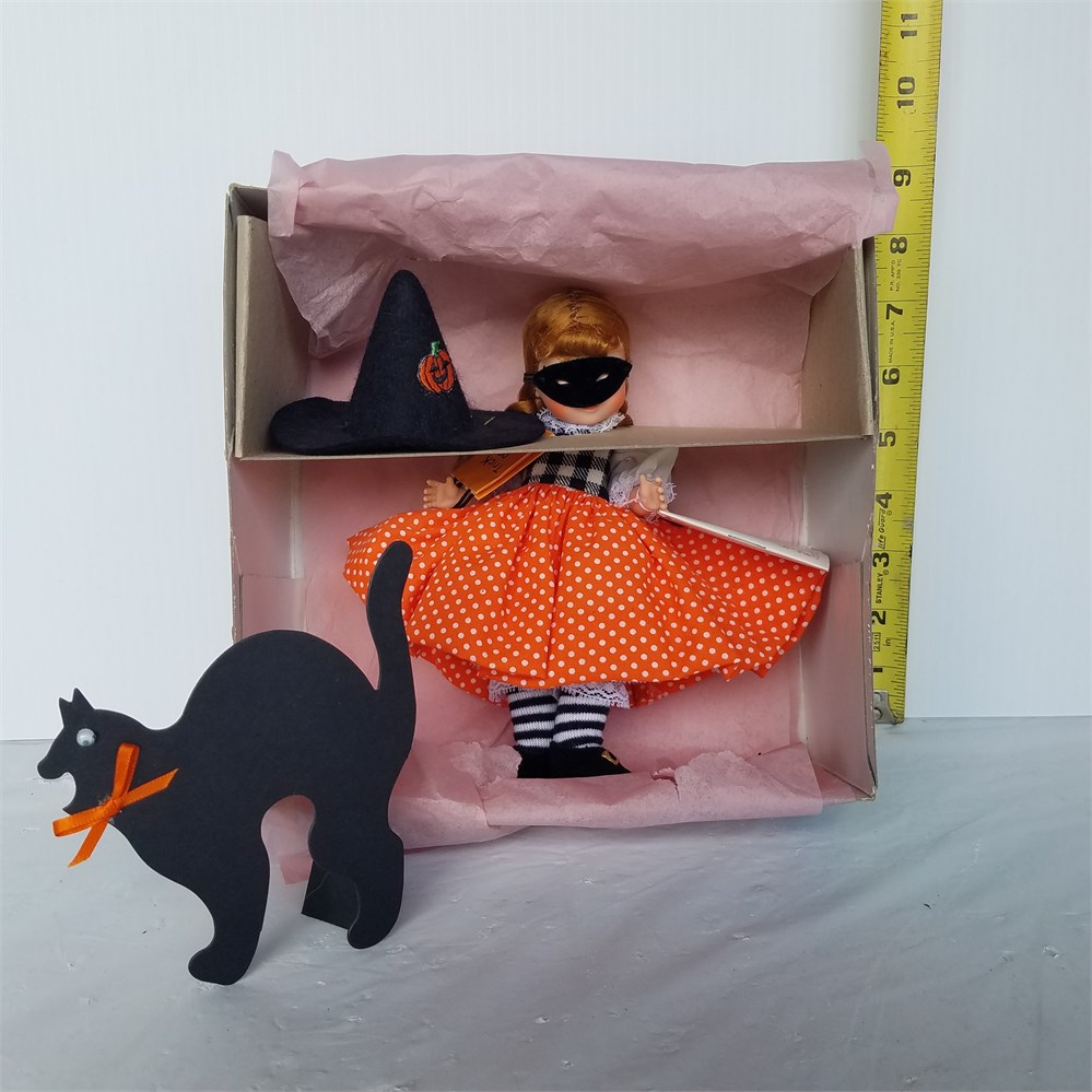 Complete: trick or treat bag, mask, slip, undergarments, striped socks,shoes with embellishments, witches hat,  CU standup cat cutout with eye and bow, card