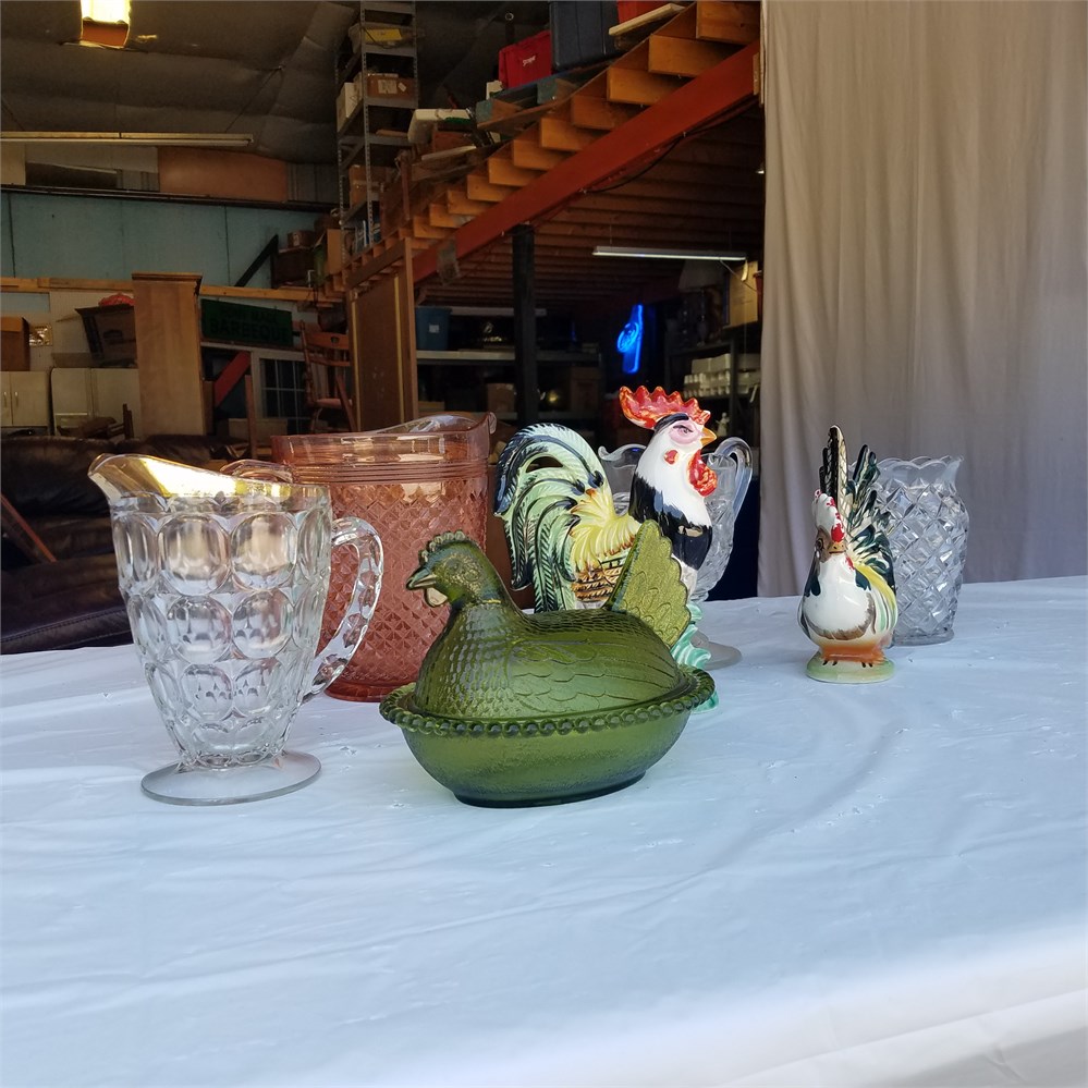 Very nice green Glass Sitting hen along with a selection of Glassware and rooster decorations.