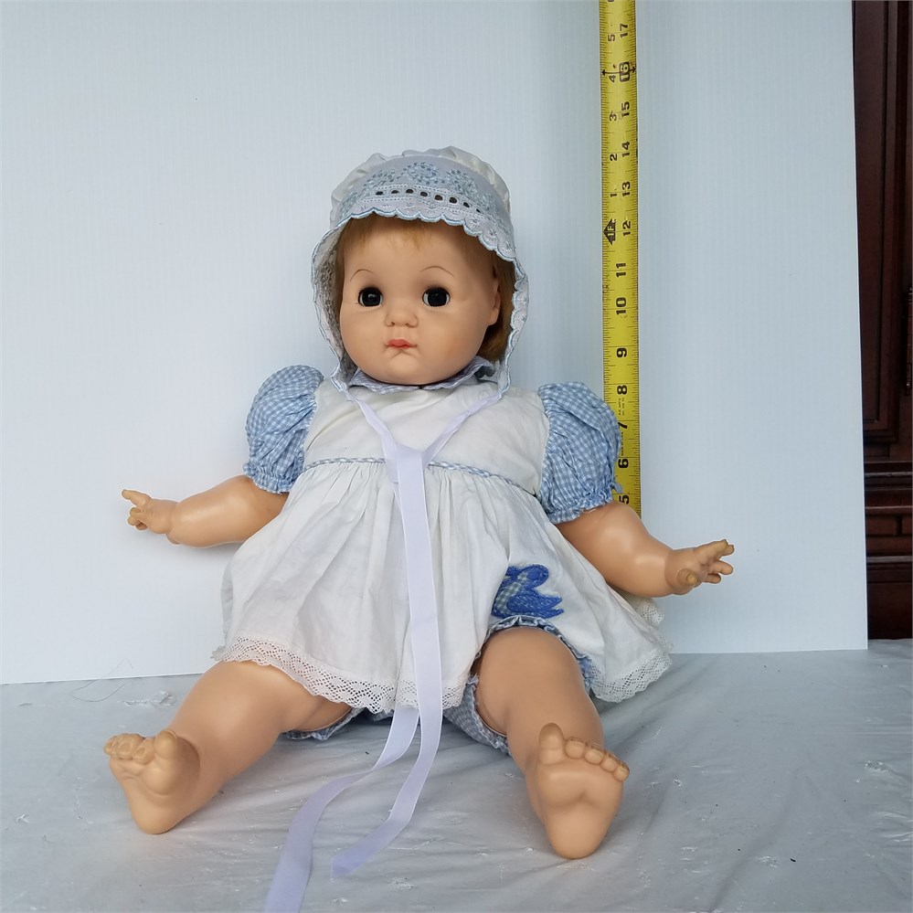 Complete: blue cotton gingham jumper dress with puff sleeves and gingham collar, cries when tilted, missing booties, (bonnet an extra)